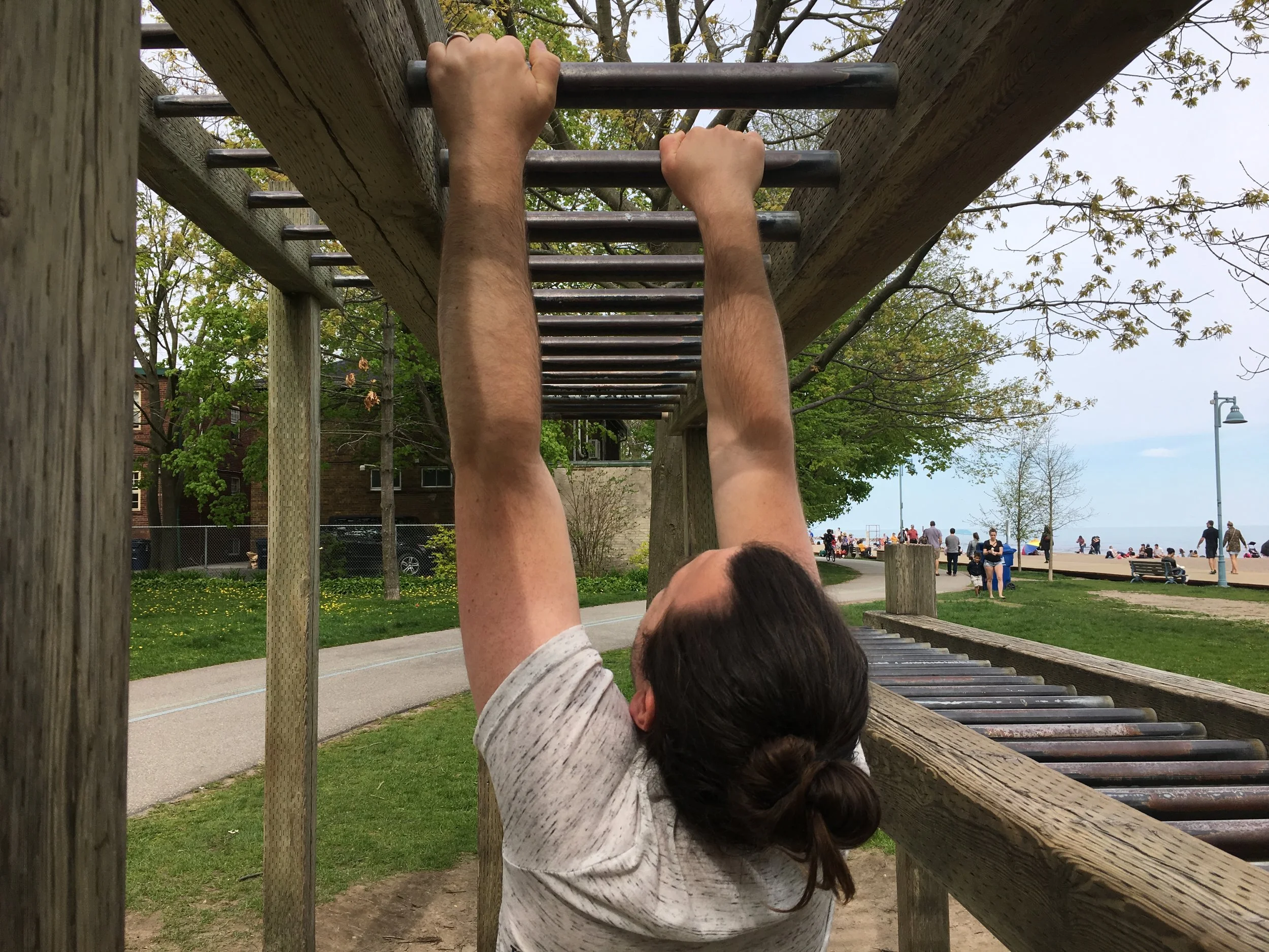 1. Hang. The monkey bars aren't just for kids anymore! Hanging is incredibly beneficial for the body and also incorporates gripping and pulling: two actions that are important for health but absent from your typical adult yoga class. When I started on the monkey bars as an adult, I couldn't believe my lack of grip strength. This was due to sensitive wrists from two pregnancies and all the heavy lifting and carrying I do daily as I care for my young children. If this is you, you can start to build strength back into your hands and wrists by practicing the monkey bars alongside your child. And I can guarantee your child will enjoy seeing you swing like a monkey!